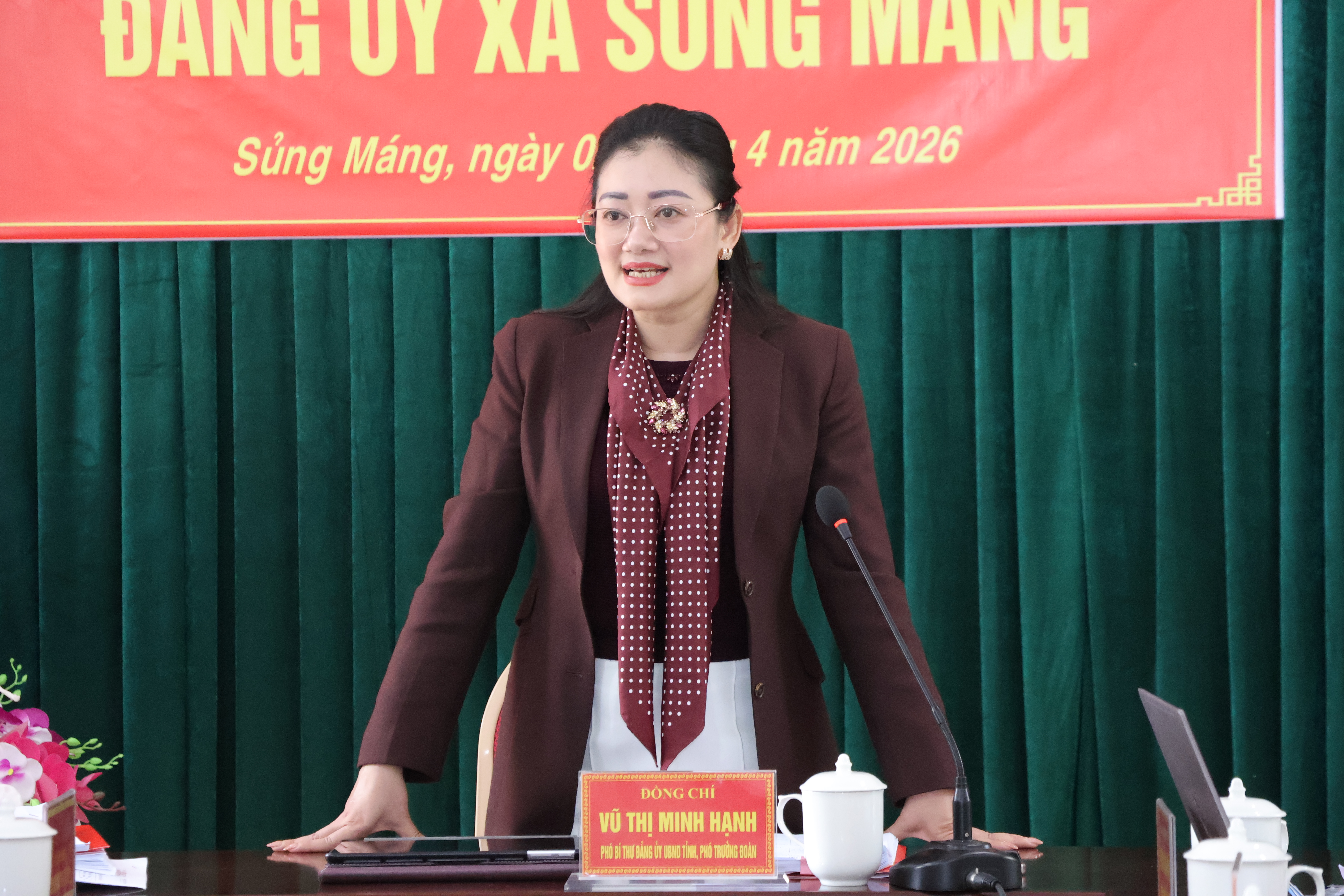 Báo cáo tại buổi làm việc nêu rõ: Ban Thường vụ Đảng ủy xã Sủng Máng đã tập trung lãnh đạo, chỉ đạo triển khai thực hiện Nghị quyết Đại hội XIV của Đảng; các nghị quyết trụ cột, chiến lược; Nghị quyết Đại hội Đảng bộ tỉnh nhiệm kỳ 2025–2030 và chương trình hành động thực hiện nghị quyết. Công tác lãnh đạo, chỉ đạo thực hiện Chỉ thị số 46-CT/TW ngày 16/5/2025 của Bộ Chính trị về cuộc bầu cử đại biểu Quốc hội khóa XVI và đại biểu HĐND các cấp nhiệm kỳ 2026–2031 được triển khai nghiêm túc; việc thực hiện Nghị quyết số 101/2025/UBTVQH15, Chỉ thị số 28/CT-TTg ngày 18/9/2025 của Thủ tướng Chính phủ và các văn bản liên quan bảo đảm tiến độ, yêu cầu đề ra. Cùng với đó, việc vận hành mô hình chính quyền địa phương 2 cấp từng bước đi vào nền nếp; công tác quản lý, triển khai kế hoạch đầu tư công được quan tâm thực hiện.