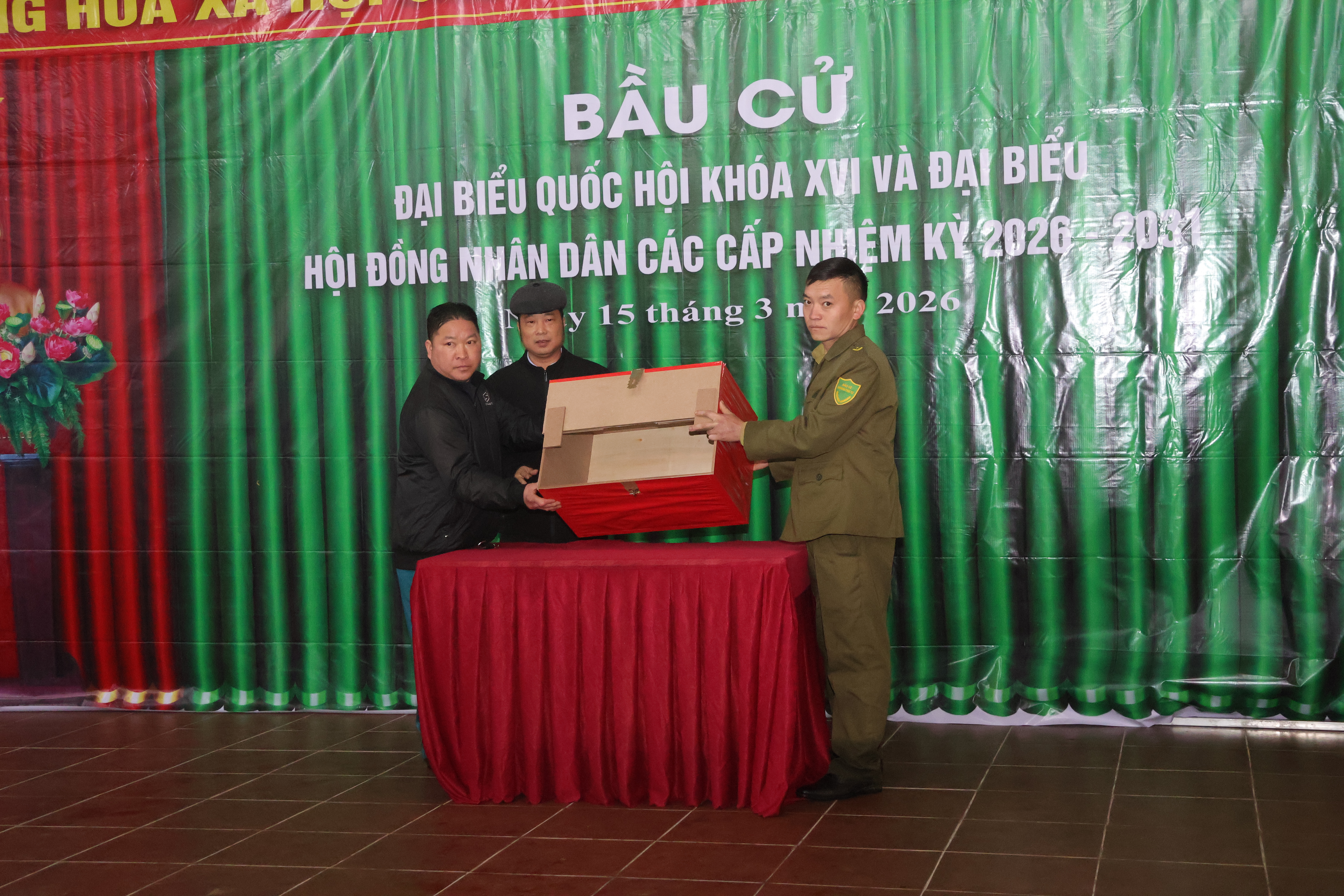 Tổ bầu cử khu vực bỏ phiếu số 01, xã Sủng Máng kiểm tra hòm phiếu trước sự chứng kiến của cử tri tại lễ khai mạc.