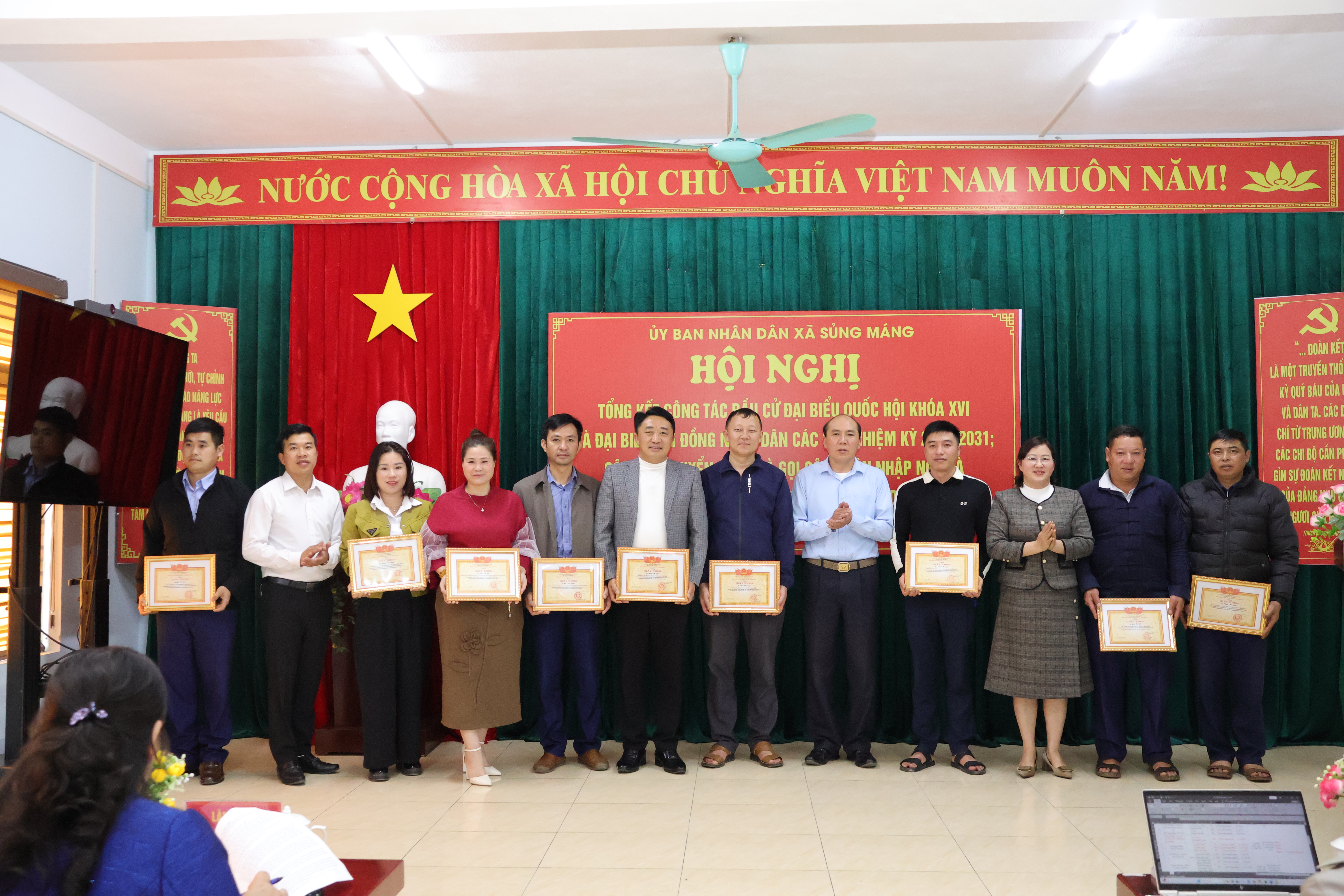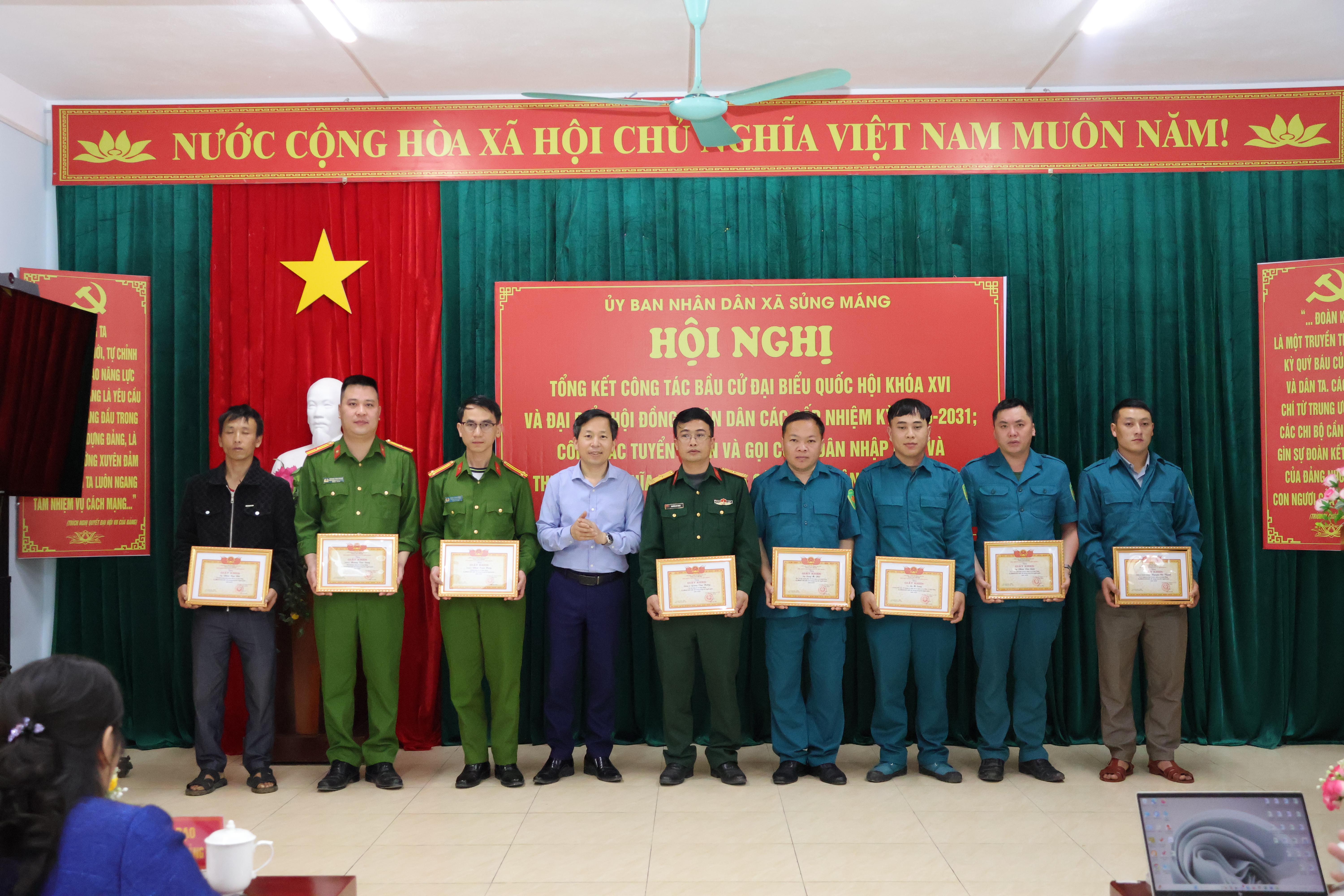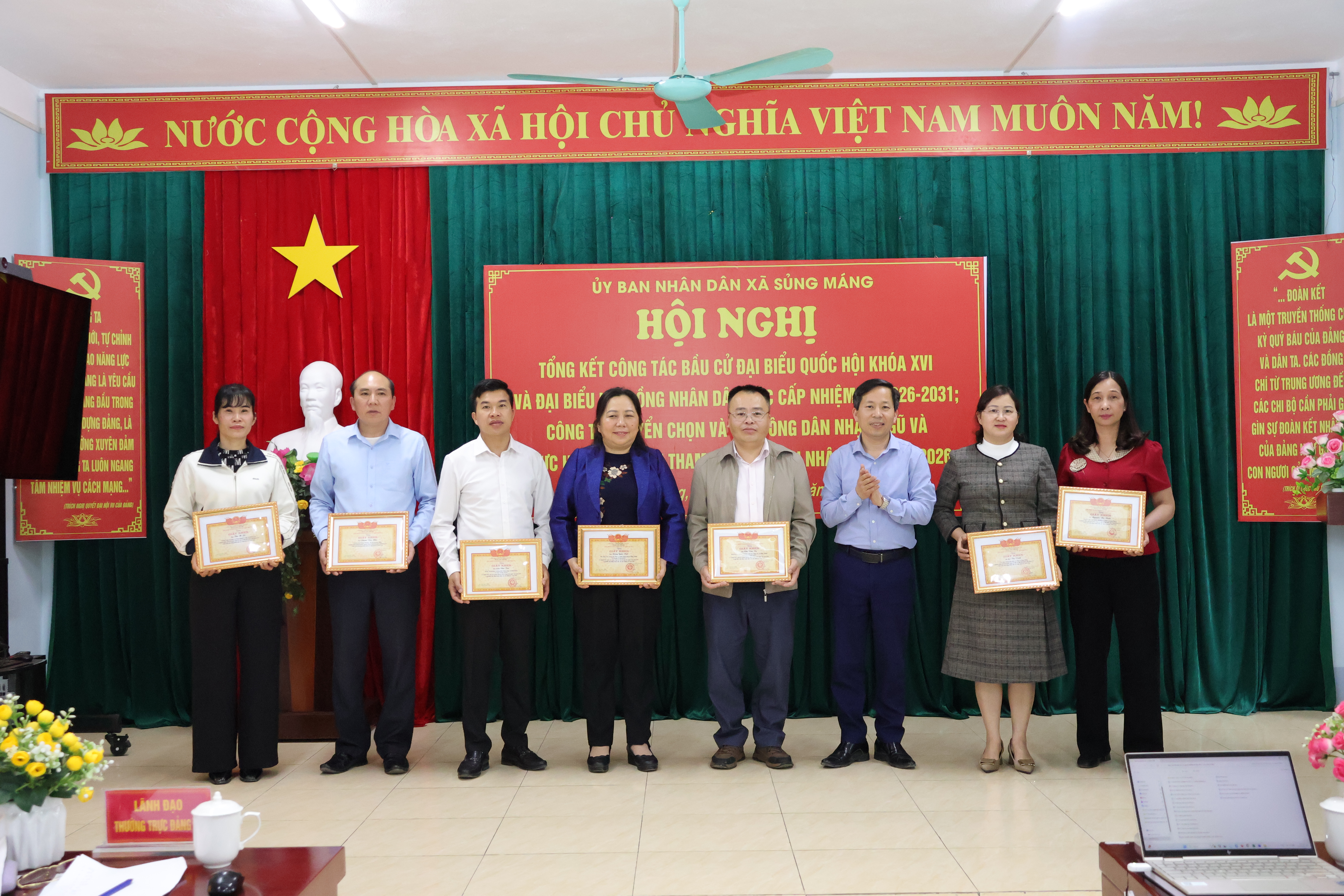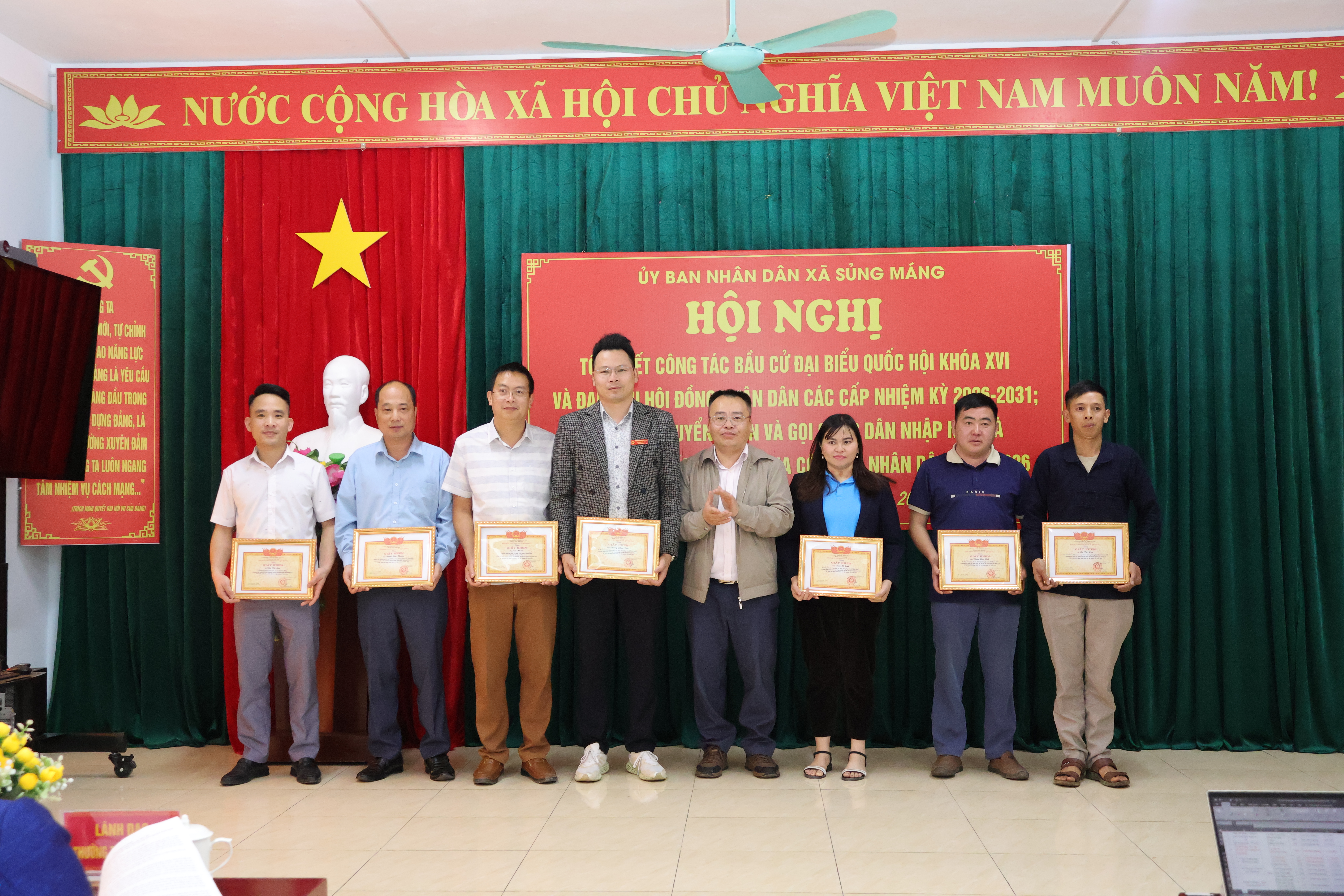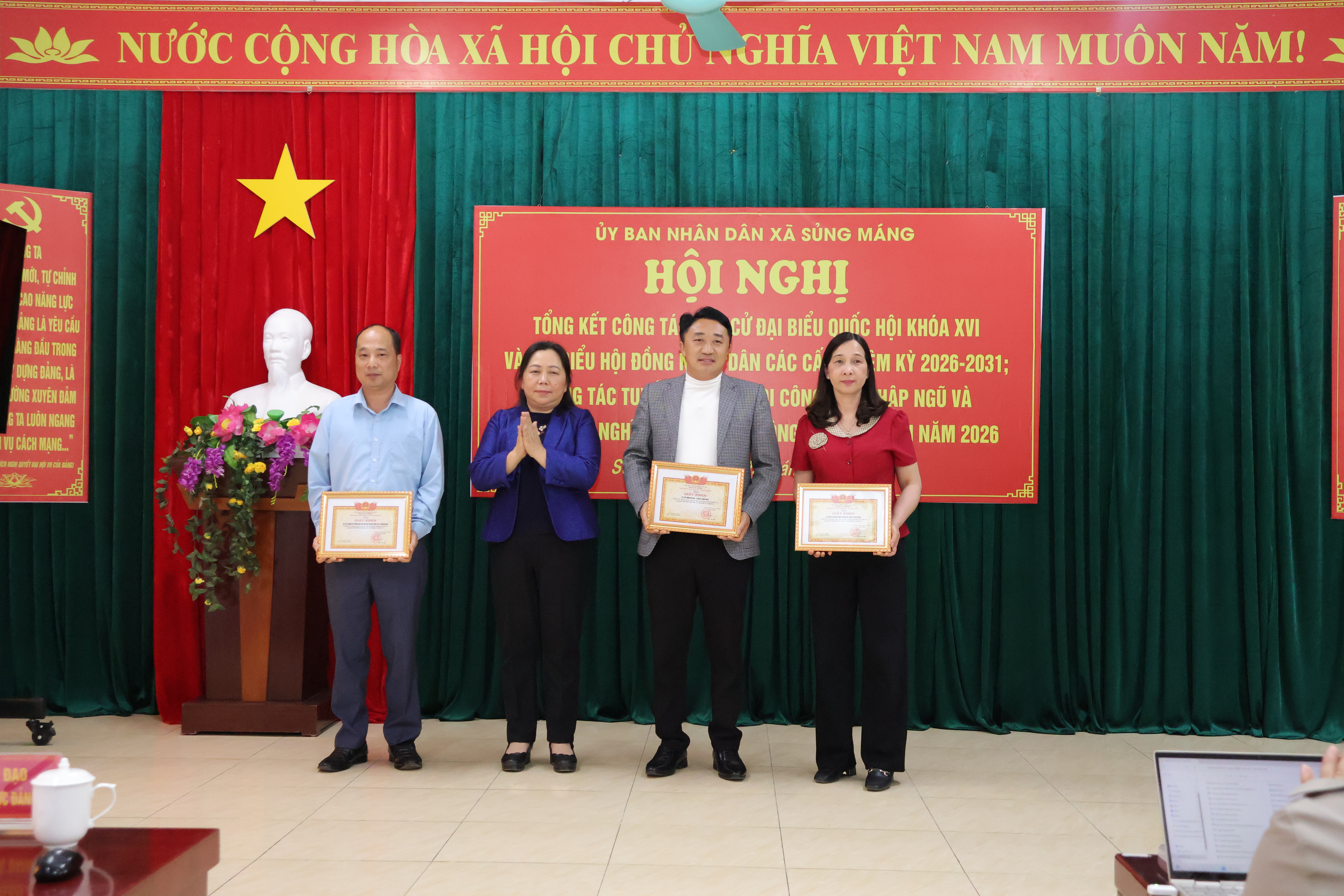 Nhân dịp này, Chủ tịch UBND xã Sủng Máng đã tặng Giấy khen cho 03 tập thể và 51 cá nhân có thành tích xuất sắc trong công tác bầu cử; khen thưởng 03 tập thể và 10 cá nhân có thành tích tiêu biểu trong công tác tuyển quân năm 2026.